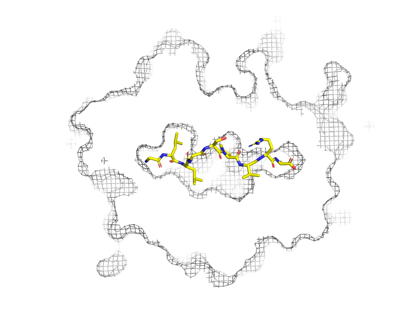 MHC:peptide complexes are visualised using PyMol. The peptide is superimposed on a consistent cutaway slice of the MHC binding cleft (displayed as a grey mesh) which best indicates the binding pockets for the P1/P5/PC positions (side view - pockets A, E, F) and for the P2/P3/PC-2 positions (top view - pockets B, C, D). In some cases peptides will use a different pocket for a specific peptide position (atypical anchoring). On some structures the peptide may appear to sterically clash with a pocket. This is an artefact of picking a standardised slice of the cleft and overlaying the peptide.